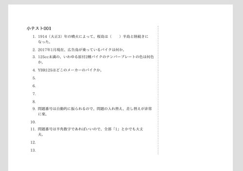 はじめに 下準備 Pandocなどのインストール cssファイル スクリプトファイル 小テスト問題文・解答作成 変換 スクリプトを使用しない場合 スクリプトを使用する場合 さいごに はじめに 教育関係者なら、1問1答の小テストプリントを作成することは多いと思う…
